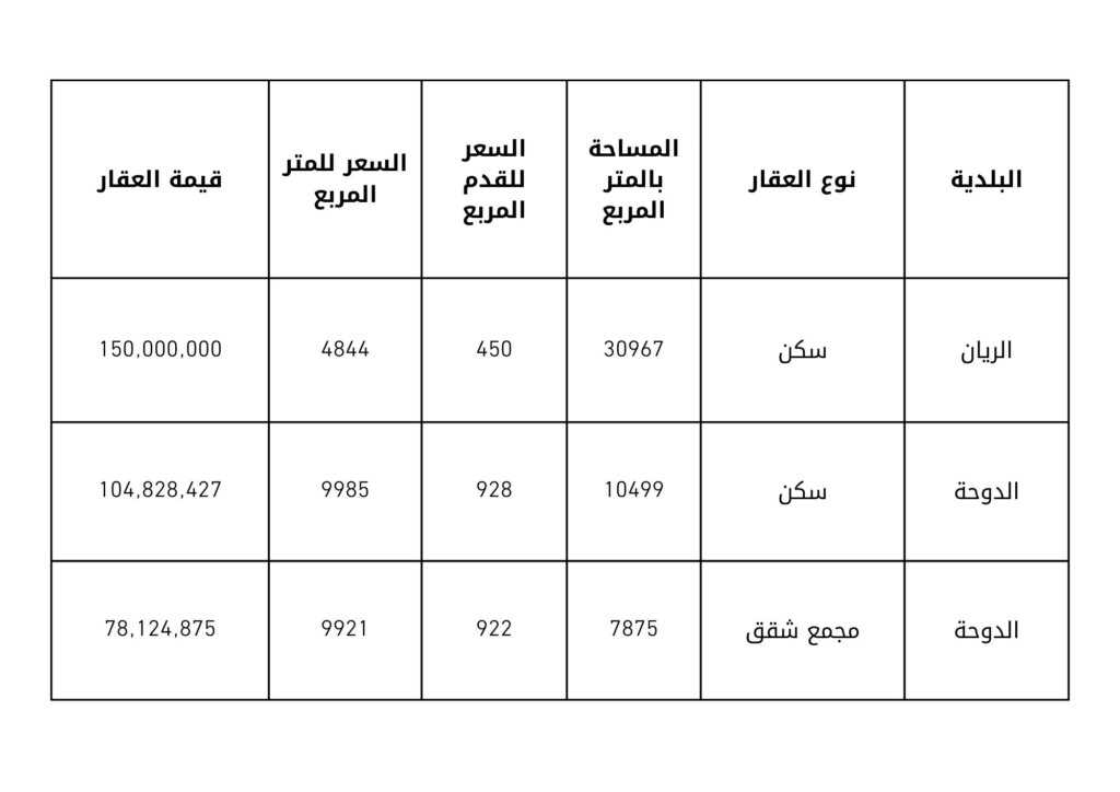 تصدر إدارة التسجيل والتوثيق العقاري بوزارة العدل في قطر تقريرًا أسبوعيًا تشارك فيه إحصاءات ،معاملات بيع العقارات. هذه النشرة العقارية الأسبوعية عامة ومتاحة لأي شخص لضمان الشفافية في سوق العقارات. يغطي هذا التقرير كل العقارات المباعة في كل أنحاء قطر سواء كانت سكنية أو تجارية.