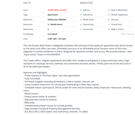 According to our research, around 50% of visitors click on “read more” on the property details page. This is a huge opportunity for you to grab the end users attention, by providing more details about the property, mentioning all unique selling points and features. The listing description length can range from 750 to 2,000 characters. Remember to also use popular keywords to help users find your units with more ease. In this section, you can add all the details about the property, and also mention the amenities included.